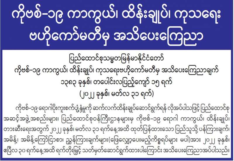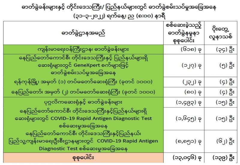 ကျန်းမာရေးဝန်ကြီးဌာနအနေဖြင့် နိုင်ငံအတွင်း ကူးစက်ဖြစ်ပွားနေသော COVID-19 ရောဂါ ကာကွယ်၊ ကုသ၊ ထိန်းချုပ်ရေးလုပ်ငန်းများကို အရှိန်အဟုန်မြှင့်ဆောင်ရွက်လျက်ရှိပါသည်။
