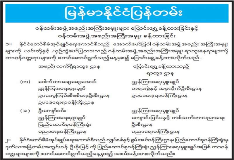 နိုင်ငံတော်၏ လူ့စွမ်းအားအရင်းအမြစ်ကို ထိမ်းသိမ်းရန်၊ လုပ်သက်ရင့်နိုင်ငံ့ဝန်ထမ်းများ၏ လုပ်ငန်းအတွေ့အကြုံနှင့် ကျွမ်းကျင်းမှုတို့အရ နိုင်ငံတော် ဖွံ့ဖြိုးတိုးတက်ရေးတွင် ဆက်လက် အထောက်အကူပြုစေရန်၊ လုပ်ငန်းကျွမ်းကျင်သည့် လုပ်သက်ရင့် နိုင်ငံ့ဝန်ထမ်းများကို နိုင်ငံတော်က ဆက်လက်ချီးမြှောက်ရန်အလို့ငှာ ပြည်ထောင်စုရာထူးဝန်အဖွဲ့သည် နိုင်ငံတော်စီမံအုပ်ချုပ်ရေးကောင်စီ ဥက္ကဋ္ဌ၏ လမ်းညွှန်မှုအရ နိုင်ငံ့ဝန်ထမ်းဥပဒေ ပုဒ်မ ၇၆၊ ပုဒ်မခွဲ (က) တွင် အပ်နှင်းထားသော လုပ်ပိုင်ခွင့်ကိုကျင့်သုံး၍ ပြည်ထောင်စုအစိုးရအဖွဲ့၏ သဘောတူညီချက်ဖြင့် နိုင်ငံ့ဝန်ထမ်းနည်းဥပဒေများ၏ နည်းဥပဒေ ၂၃၀ ပါ ဝန်ထမ်းတစ်ဦး အငြိမ်းစားယူရမည့် နေ့ရက်အား ယင်းဝန်ထမ်း ၆၂ နှစ်ပြည့်သည့်နေ့ဟု နိုင်ငံ့ဝန်ထမ်း နည်းဥပဒေများကို စတုတ္ထအကြိမ်ပြင်ဆင်သည့်နည်းဥပဒေများဖြင့် ပြင်ဆင်ခဲ့ကြောင်း သက်ဆိုင်ရာမှ သတင်းရရှိသည်။
