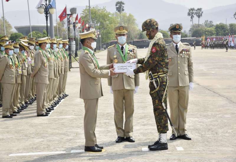 (၇၇)နှစ်မြောက်တပ်မတော်နေ့ စစ်ရေးပြအခမ်းအနားတွင် ဆုရရှိကြသော စစ်ရေးပြတပ်ခွဲများအား ဂုဏ်ပြုဆုချီးမြှင့်ပွဲကို ယနေ့နံနက်ပိုင်းတွင် နေပြည်တော်ရှိ စုရပ် သစ်တပ်စစ်ရေးပြကွင်း၌ ကျင်းပပြုလုပ်ရာ တပ်မတော်နေ့ကျင်းပရေးဦးစီး ကော်မတီ ဥက္ကဋ္ဌ ညှိနှိုင်းကွပ်ကဲရေးမှူး(ကြည်း၊ ရေ၊ လေ) ဗိုလ်ချုပ်ကြီး မောင်မောင်အေး တက်ရောက်၍ ဆုများကို ပေးအပ်ချီးမြှင့်သည်။