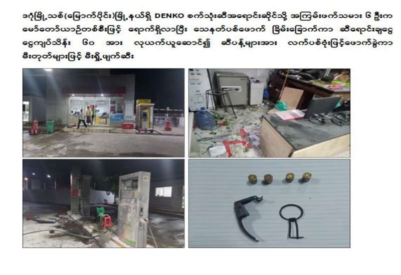 ရန်ကုန်တိုင်းဒေသကြီး၊ ဒဂုံမြို့သစ်(မြောက်ပိုင်း)မြို့နယ်ရှိ DENKO စက်သုံးဆီ အရောင်းဆိုင်သို့ အကြမ်းဖက်သမား ၆ ဦးက မော်တော်ယာဉ်တစ်စီးဖြင့် ရောက်ရှိလာပြီး သေနတ်ပစ်ဖောက် ခြိမ်းခြောက်ကာ ဆီရောင်းချငွေ ငွေကျပ်သိန်း ၆၀ အား လုယက်ယူဆောင်၍ ဆီပန့်များအား လက်ပစ်ဗုံးဖြင့်ဖောက်ခွဲကာ မီးတုတ်များဖြင့် မီးရှို့ဖျက်ဆီးခဲ့ကြောင်း သိရသည်။