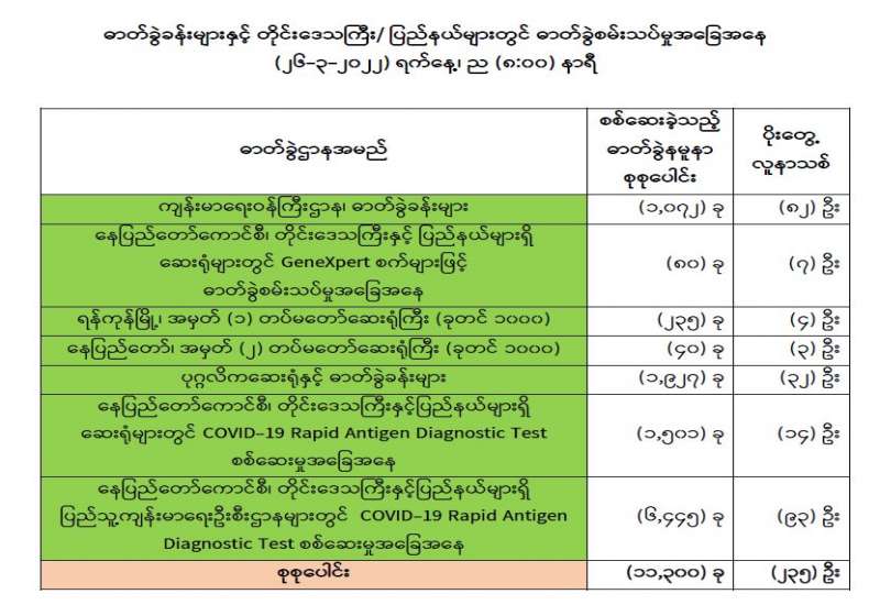 ကျန်းမာရေးဝန်ကြီးဌာနအနေဖြင့် နိုင်ငံအတွင်းကူးစက်ဖြစ်ပွားနေသော COVID-19 ရောဂါ ကာကွယ်၊ ကုသ၊ ထိန်းချုပ်ရေးလုပ်ငန်းများကို အရှိန်အဟုန်မြှင့် ဆောင်ရွက်လျက်ရှိပါသည်။
