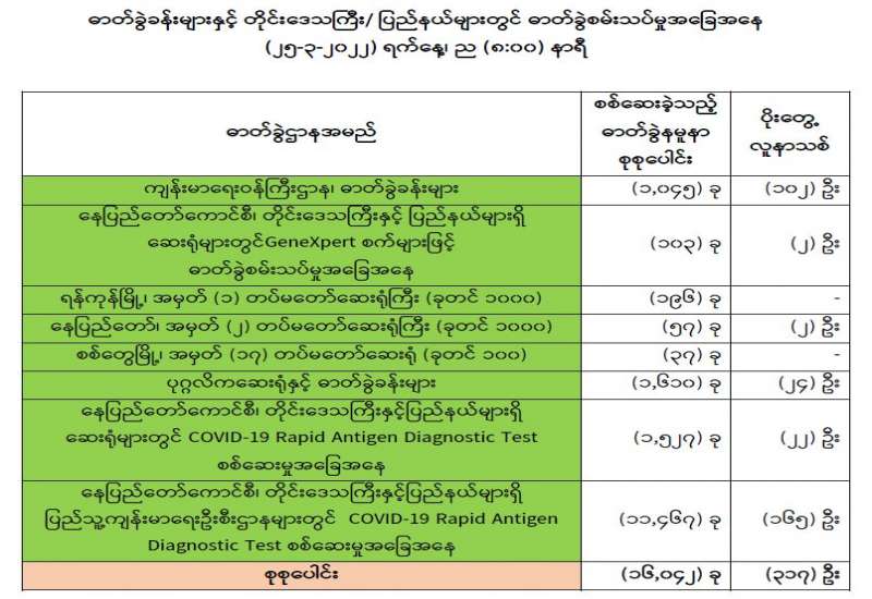ကျန်းမာရေးဝန်ကြီးဌာနအနေဖြင့် နိုင်ငံအတွင်း ကူးစက်ဖြစ်ပွားနေသော COVID-19 ရောဂါ ကာကွယ်၊ ကုသ၊ ထိန်းချုပ်ရေးလုပ်ငန်းများကို အရှိန်အဟုန်မြှင့် ဆောင်ရွက်လျက်ရှိပါသည်။