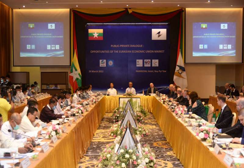 မြန်မာနိုင်ငံနှင့် ဥရောပအာရှစီးပွားရေးသမဂ္ဂ(EAEU)တို့အကြား ရင်းနှီးမြှုပ်နှံမှုနှင့် ကုန်သွယ်မှု မြှင့်တင်ဆောင်ရွက်သွားနိုင်ရန် ရည်ရွယ်၍ နှစ်ဖက်အစိုးရအဖွဲ့အစည်းများနှင့် စီးပွားရေး လုပ်ငန်းရှင်များပါဝင်သော ဆွေးနွေးပွဲကို ယနေ့ မွန်းလွဲ ၁ နာရီတွင် ရင်းနှီးမြှုပ်နှံမှုနှင့် နိုင်ငံခြားစီးပွားဆက်သွယ်ရေး ဝန်ကြီးဌာနနှင့် ဥရောပအာရှ စီးပွားရေးကော်မရှင်တို့က ဦးဆောင် ၍ နေပြည်တော်ရှိ Park Royal Hotel ၌ ကျင်းပသည်။