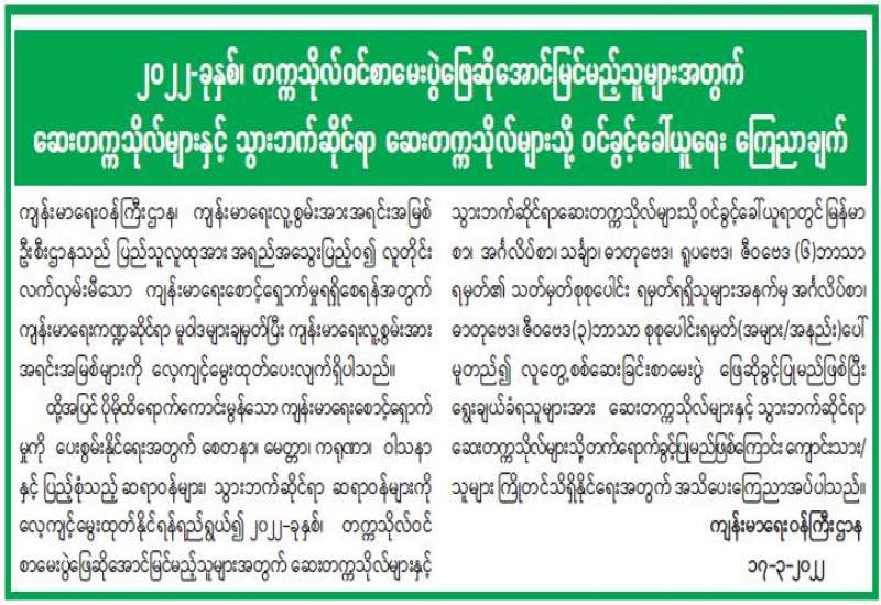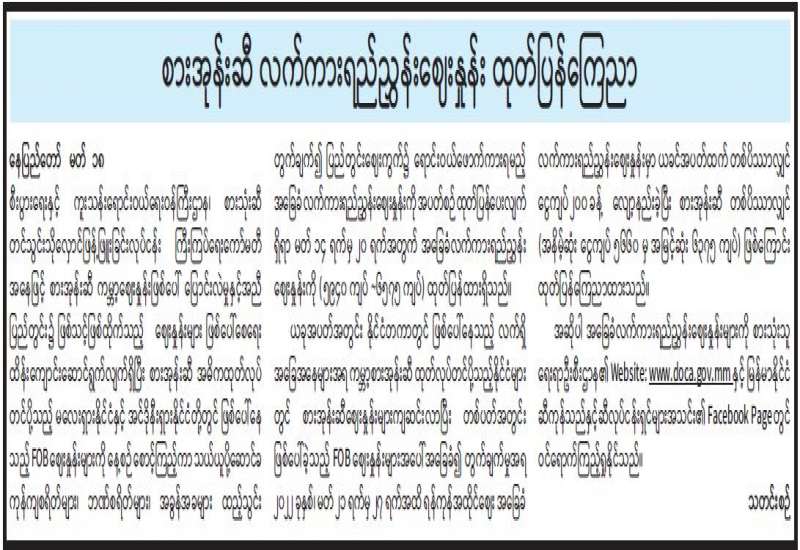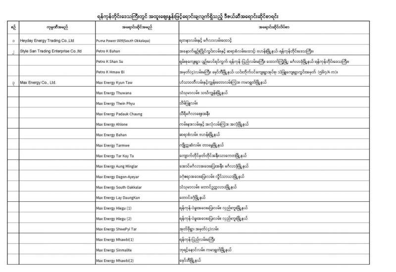 စီးပွားရေးနှင့် ကူးသန်းရောင်းဝယ်ရေးဝန်ကြီးဌာနနှင့် မြန်မာနိုင်ငံ စက်သုံးဆီ တင်သွင်းရောင်းချ ဖြန့်ဖြူးရေးအသင်းတို့ ပူးပေါင်းစီစဉ်မှုဖြင့် ပြည်သူများသက်သာသော ဈေးနှုန်းဖြင့်ဝယ်ယူ ရရှိနိုင်ရန်ရည်ရွယ်၍ ဗဟိုဘဏ်မှ ရည်ညွှန်းငွေလဲနှုန်းဖြင့် တိုက်ရိုက်ရောင်းချပေးသည့် နိုင်ငံခြား ငွေအမေရိကန်ဒေါ်လာ ၃၉ သန်းဖြင့် စက်သုံးဆီမှာယူတင် သွင်းခဲ့သည့် ကုမ္ပဏီ ၂၆ ခုမှ ဒီဇယ်ဆီ ဂါလံ ၁၂ ဒသမ ၅၄ သန်းခန့်ကို အထူးဈေးနှုန်းဖြင့် ဖြန့်ဖြူးရောင်းချပေးလျက်ရှိပြီး မတ်လ ၁၉ ရက် နေ့တွင် ကုမ္ပဏီ ၁၂ ခုမှ တိုင်းဒေသကြီး/ ပြည်နယ်များရှိ စက်သုံးဆီ အရောင်းဆိုင် စုစုပေါင်း ၁၁၃ ဆိုင်တွင် ဖြန့်ဖြူးရောင်းချ ပေးသွားမည်ဖြစ်သည်။