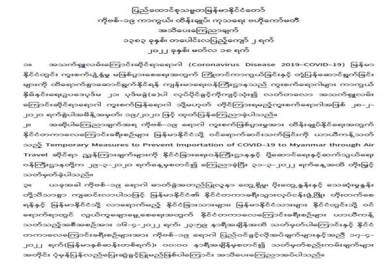 ၁။ ကျန်းမာရေးဝန်ကြီးဌာနသည် “ကိုဗစ်-၁၉ ရောဂါ မျိုးရိုးဗီဇပြောင်းရောဂါပိုး စောင့်ကြပ် ကြည့်ရှုခြင်းလုပ်ငန်း”များကို စဉ်ဆက်မပြတ် ဆောင်ရွက်လျက်ရှိရာ မြန်မာနိုင်ငံသို့ ပြည်ပနိုင်ငံ များမှ ကယ်ဆယ်ရေးလေယာဉ် (Relief Flight) များဖြင့် ပြန်လည်ဝင်ရောက် လာသူများ၊ မြန်မာနိုင်ငံအတွင်း အစုလိုက်ကူးစက်ဖြစ်ပွားမှုများနှင့် ပြည်တွင်းကူးစက်မှုများမှ ဓာတ်ခွဲနမူနာ ရယူ၍ ဓာတ်ခွဲစစ်ဆေးလျက်ရှိပြီး Omicron (အိုမီခရွန်) အပါအဝင် ကိုဗစ်-၁၉ ရောဂါ မျိုးရိုးဗီဇပြောင်းရောဂါပိုး တွေ့ရှိမှုများနှင့် ပတ်သက်၍ ကျန်းမာရေးဝန်ကြီးဌာနမှ အချိန်နှင့် တစ်ပြေးညီ သတင်းထုတ်ပြန် ပေးလျက်ရှိပါသည်။