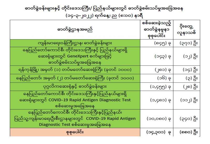 (၁၄-၃-၂၀၂၂) ရက်နေ့၊ ည (၈:၀၀) နာရီ ကျန်းမာရေးဝန်ကြီးဌာနအနေဖြင့် နိုင်ငံအတွင်း ကူးစက်ဖြစ်ပွားနေသော COVID-19 ရောဂါ ကာကွယ်၊ ကုသ၊ ထိန်းချုပ်ရေးလုပ်ငန်းများကို အရှိန်အဟုန်မြှင့်ဆောင်ရွက်လျက်ရှိပါသည်။
