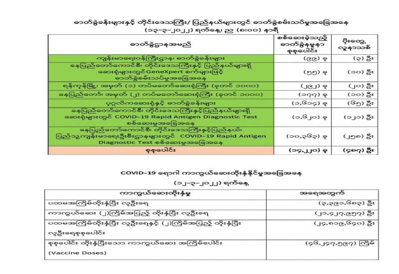 ကျန်းမာရေးဝန်ကြီးဌာနအနေဖြင့် နိုင်ငံအတွင်း ကူးစက်ဖြစ်ပွားနေသော COVID-19 ရောဂါ ကာကွယ်၊ ကုသ၊ ထိန်းချုပ်ရေး လုပ်ငန်းများကို အရှိန်အဟုန်မြှင့်ဆောင်ရွက်လျက်ရှိရာ ရောဂါထိန်းချုပ်ရေးလုပ်ငန်းများ အောင်မြင်နိုင်ရေးအတွက် ပြည်သူလူထု အနေဖြင့် ကျန်းမာရေးဝန်ကြီးဌာနမှ ထုတ်ပြန်ထားသော COVID-19 ရောဂါ ကာကွယ်ထိန်းချုပ်ရေးဆိုင်ရာ စည်းကမ်းများကို စနစ်တကျ လိုက်နာဆောင်ရွက်ရန် လိုအပ်ပြီး COVID-19 ကာကွယ်ဆေးထိုးနှံမှုခံယူခြင်းအား အထူးဂရုပြု ပူးပေါင်းဆောင်ရွက် ကြရန် လိုအပ်ပါသည်။