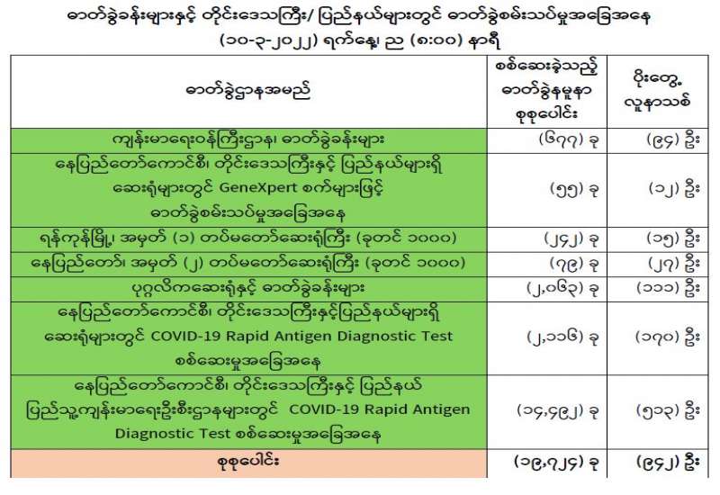 ကျန်းမာရေးဝန်ကြီးဌာနအနေဖြင့် နိုင်ငံအတွင်း ကူးစက်ဖြစ်ပွားနေသော COVID-19 ရောဂါ ကာကွယ်၊ ကုသ၊ ထိန်းချုပ်ရေးလုပ်ငန်းများကို အရှိန်အဟုန်မြှင့် ဆောင်ရွက်လျက်ရှိပါသည်။