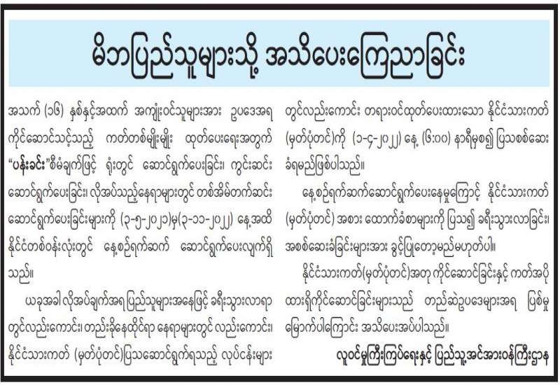 ကျန်းမာရေးဝန်ကြီးဌာနအနေဖြင့် နိုင်ငံအတွင်း ကူးစက်ဖြစ်ပွားနေသော COVID-19 ရောဂါ ကာကွယ်၊ ကုသ၊ ထိန်းချုပ်ရေးလုပ်ငန်းများကို အရှိန်အဟုန်မြှင့် ဆောင်ရွက်လျက်ရှိရာ ရောဂါထိန်းချုပ်ရေးလုပ်ငန်းများ အောင်မြင်နိုင်ရေးအတွက် ပြည်သူလူထုအနေဖြင့် ကျန်းမာရေးဝန်ကြီးဌာနမှ ထုတ်ပြန်ထားသော COVID-19 ရောဂါကာကွယ် ထိန်းချုပ်ရေးဆိုင်ရာ စည်းကမ်းများကို စနစ်တကျလိုက်နာ ဆောင်ရွက်ရန်လိုအပ်ပြီး COVID-19 ကာကွယ်ဆေး ထိုးနှံမှုခံယူခြင်းအား အထူးဂရုပြု ပူးပေါင်းဆောင်ရွက်ကြရန် လိုအပ်ပါသည်။