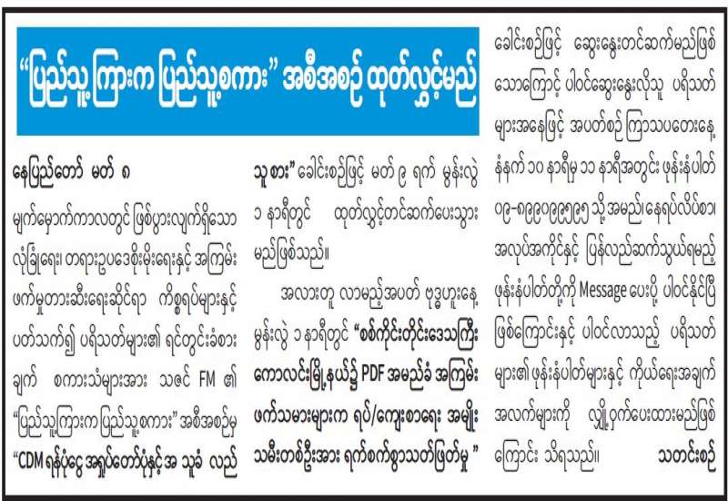 CRPH၊ NUG နှင့် PDF အမည်ခံအကြမ်းဖက်အဖွဲ့များသည် ပြည်သူလူထု အထိတ်တလန့် ဖြစ်စေရန်အတွက် မိုင်းထောင်ဖောက်ခွဲဖျက်ဆီးခြင်း၊ အပြစ်မဲ့ပြည်သူများနှင့် ဆရာတော်၊ သံဃာတော်များပါမကျန် လုပ်ကြံသတ်ဖြတ်ခြင်း၊ မြို့ရွာများတွင် တက္ကသိုလ်များ၊ အခြေခံပညာကျောင်းများ ပြန်လည်ဖွင့်လှစ် သင်ကြားပေးလျက်ရှိရာ ကျောင်းသား၊ ကျောင်းသူများ ပညာသင်ကြားနေမှုများအပေါ် အကြမ်းဖက်အဖွဲ့များက စာသင်ကျောင်းများအား မိုင်းထောင် ဖောက်ခွဲခြင်း၊ မီးရှို့ဖျက်ဆီးခြင်းစသည့် အကြမ်းဖက်လုပ်ရပ်များကို အသိတရားမဲ့စွာ လုပ်ဆောင်လျက်ရှိသည်။