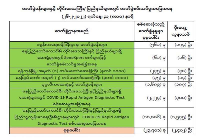 ကျန်းမာရေးဝန်ကြီးဌာနအနေဖြင့် နိုင်ငံအတွင်း ကူးစက်ဖြစ်ပွားနေသော COVID-19 ရောဂါ ကာကွယ်၊ ကုသ၊ ထိန်းချုပ်ရေးလုပ်ငန်းများကို အရှိန်အဟုန်မြှင့် ဆောင်ရွက်လျက်ရှိပါသည်။