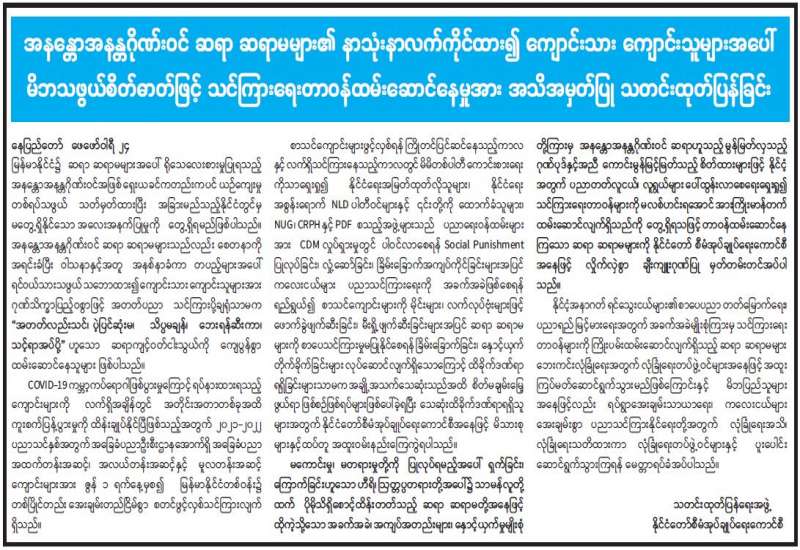 ကိုဗစ်-၁၉ ရောဂါ ဓာတ်ခွဲအတည်ပြုပိုးတွေ့လူနာများနှင့် သီးသန့်စောင့်ကြည့် ရမည့်သူများအား တပ်မတော်ဆေးရုံများ၊ ပြည်သူ့ ဆေးရုံများ၊ ကျန်းမာရေးဌာနများနှင့် ကိုဗစ်စင်တာများတွင် ကျန်းမာရေးစောင့်ရှောက်မှုလုပ်ငန်းများနှင့် ကိုဗစ်-၁၉ ရောဂါကာ ကွယ်ဆေးထိုးခြင်း လုပ်ငန်း များကို တပ်မတော်သားဆရာဝန်များ၊ ကျန်းမာရေးဝန်ထမ်းများ၊ လူမှုရေးအသင်းအဖွဲ့များ ပူးပေါင်း၍