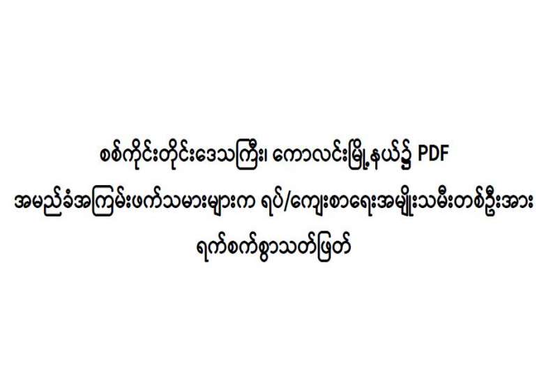ဝန်ထမ်းကျင့်ဝတ်များနှင့်အညီ နိုင်ငံတော်အပေါ်သစ္စာစောင့်သိ၍ အလုပ်တာဝန်များကို ထမ်းဆောင်လျက်ရှိသည့် နိုင်ငံ့ဝန်ထမ်း များအား အကြမ်းဖက်သမားများအနေဖြင့် လူအုပ်စုဖွဲ့၍ လက်နက်အားကိုးဖြင့် အနိုင်အထက်ပြုကျင့်ကာ အတင်းအကြပ် CDM ပြုလုပ်စေပြီး CDM ပြုလုပ်ခြင်းမရှိသူ နိုင်ငံ့ဝန်ထမ်းများနှင့် အေးချမ်းစွာ နေထိုင်လျက်ရှိသော ပြည်သူလူထုများအား “သူလျှို၊ ဒလန်၊ သတင်းပေး” ဟုစွပ်စွဲကာ ဖမ်းဆီးသတ်ဖြတ်ခြင်းများ ပြုလုပ်လျက်ရှိရာ ဖေဖော်ဝါရီလ ၂၂ ရက်နေ့၌ စစ်ကိုင်း တိုင်းဒေသကြီး၊ ကောလင်းမြို့နယ်၌ PDF အမည်ခံ အကြမ်းဖက်သမားများက မင်းကုန်းကျေးရွာနေ ရပ်/ကျေးစာရေး အမျိုးသမီး တစ်ဦးအား ရက်စက်စွာသတ်ဖြတ်ခဲ့ကြောင်း သိရသည်။