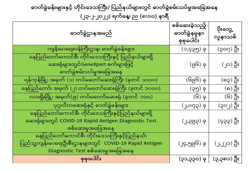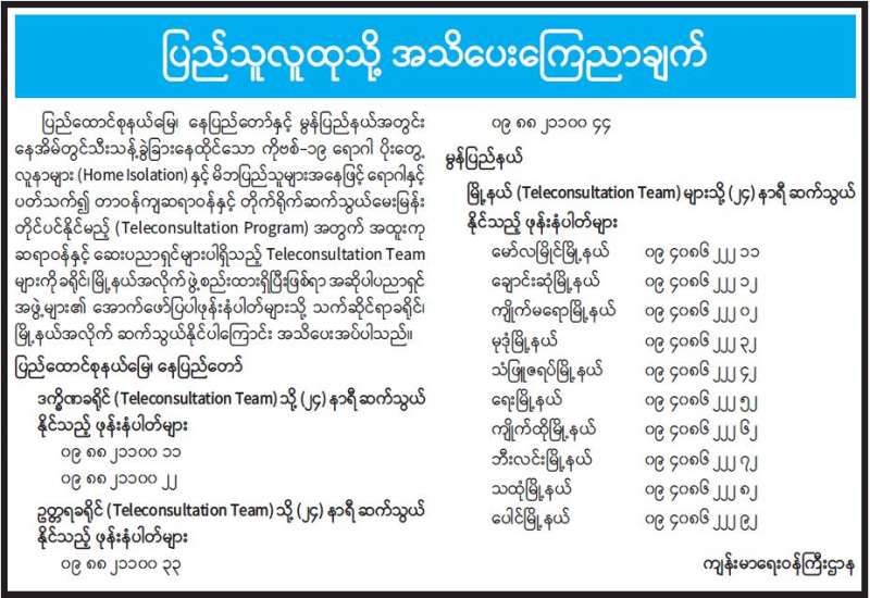 ကျန်းမာရေးဝန်ကြီးဌာနအနေဖြင့် နိုင်ငံအတွင်း ကူးစက်ဖြစ်ပွားနေသော COVID-19 ရောဂါ ကာကွယ်၊ ကုသ၊ ထိန်းချုပ်ရေး လုပ်ငန်းများကို အရှိန်အဟုန်မြှင့်ဆောင်ရွက်လျက်ရှိရာ ရောဂါ ထိန်းချုပ်ရေးလုပ်ငန်းများ အောင်မြင်နိုင်ရေးအတွက် ပြည်သူလူထု အနေဖြင့် ကျန်းမာရေးဝန်ကြီးဌာနမှ ထုတ်ပြန်ထားသော COVID-19 ရောဂါကာကွယ်ထိန်းချုပ်ရေးဆိုင်ရာ ည်းကမ်းများကို စနစ်တကျလိုက်နာ ဆောင်ရွက်ရန်လိုအပ်ပြီး COVID-19 ကာကွယ်ဆေးထိုးနှံမှုခံယူခြင်းအား အထူးဂရုပြု ပူးပေါင်းဆောင်ရွက် ကြရန်လိုအပ်ပါသည်။