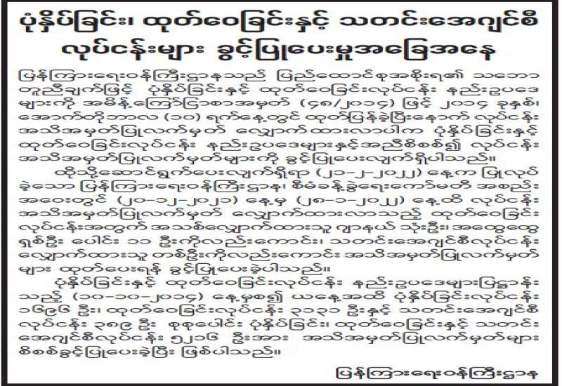 ပြန်ကြားရေးဝန်ကြီးဌာနသည် ပြည်ထောင်စုအစိုးရ၏ သဘောတူညီချက်ဖြင့် ပုံနှိပ်ခြင်း နှင့်ထုတ်ဝေခြင်းလုပ်ငန်း နည်းဥပဒေများကို အမိန့်ကြော်ငြာစာအမှတ် (၄၈/၂၀၁၄) ဖြင့် ၂၀၁၄ ခုနှစ်၊ အောက်တိုဘာလ (၁၀) ရက်နေ့တွင် ထုတ်ပြန်ခဲ့ပြီးနောက် လုပ်ငန်းအသိအမှတ်ပြု လက်မှတ် လျှောက်ထားလာပါက ပုံနှိပ်ခြင်းနှင့်ထုတ်ဝေခြင်းလုပ်ငန်း နည်းဥပဒေများနှင့်အညီ စိစစ်၍ လုပ်ငန်း အသိအမှတ်ပြု လက်မှတ်များကို ခွင့်ပြုပေးလျက်ရှိပါသည်။