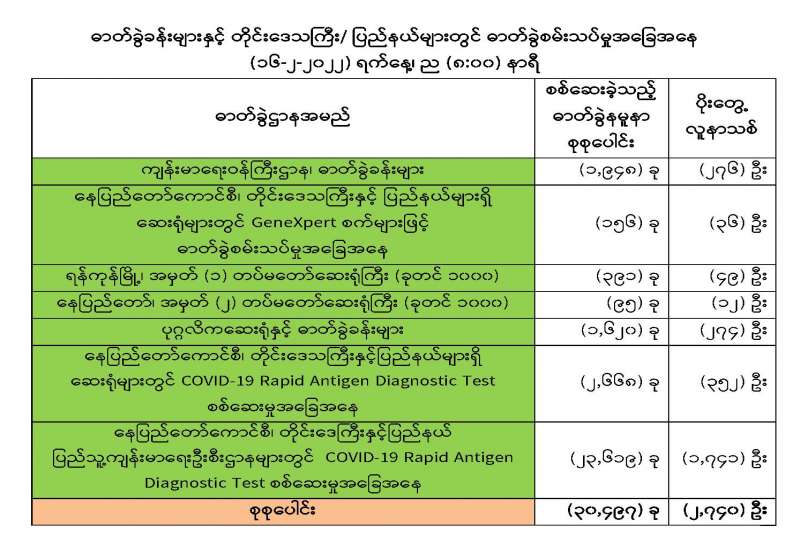 ကျန်းမာရေးဝန်ကြီးဌာနအနေဖြင့် နိုင်ငံအတွင်း ကူးစက်ဖြစ်ပွားနေသော COVID-19 ရောဂါ ကာကွယ်၊ ကုသ၊ ထိန်းချုပ်ရေး လုပ်ငန်းများကို အရှိန်အဟုန်မြှင့် ဆောင်ရွက်လျက်ရှိရာ ရောဂါထိန်းချုပ်ရေး လုပ်ငန်းများ အောင်မြင်နိုင်ရေးအတွက် ပြည်သူလူထုအနေဖြင့် ကျန်းမာရေးဝန်ကြီးဌာနမှ ထုတ်ပြန်ထားသော COVID-19 ရောဂါကာကွယ် ထိန်းချုပ်ရေးဆိုင်ရာ စည်းကမ်းများကို စနစ်တကျ လိုက်နာဆောင်ရွက်ရန်လိုအပ်ပြီး COVID-19 ကာကွယ်ဆေး ထိုးနှံမှုခံယူခြင်းအား အထူးဂရုပြု ပူးပေါင်းဆောင်ရွက်ကြရန် လိုအပ်ပါသည်။