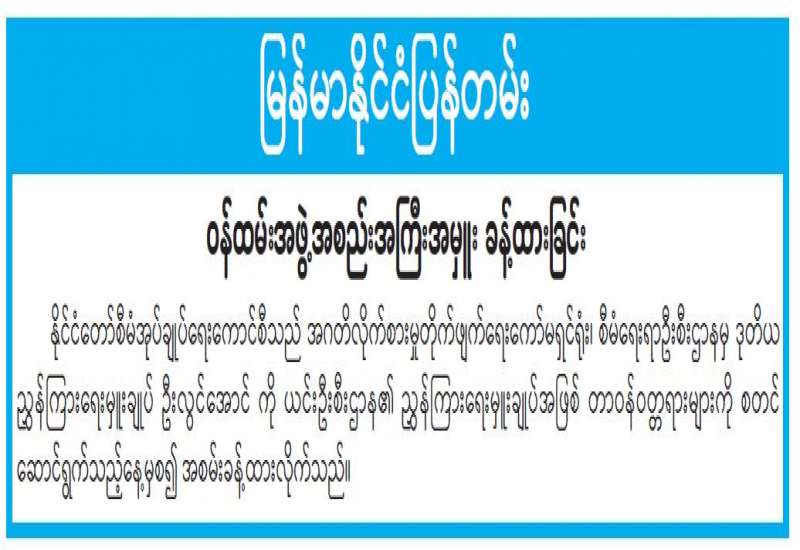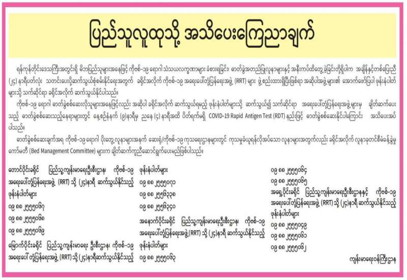 ကျန်းမာရေးဝန်ကြီးဌာနအနေဖြင့် နိုင်ငံအတွင်း ကူးစက်ဖြစ်ပွားနေသော COVID-19 ရောဂါ ကာကွယ်၊ ကုသ၊ ထိန်းချုပ်ရေးလုပ်ငန်းများကို အရှိန်အဟုန် မြှင့်ဆောင်ရွက်လျက်ရှိရာ ရောဂါထိန်းချုပ်ရေးလုပ်ငန်းများ အောင်မြင်နိုင်ရေးအတွက် ပြည်သူလူထုအနေဖြင့် ကျန်းမာရေးဝန်ကြီးဌာနမှ ထုတ်ပြန်ထား သော COVID-19 ရောဂါကာကွယ် ထိန်းချုပ်ရေးဆိုင်ရာ စည်းကမ်းများကို စနစ်တကျ လိုက်နာဆောင်ရွက်ရန်လိုအပ်ပြီး COVID-19 ကာကွယ်ဆေးထိုးနှံမှု ခံယူခြင်းအား အထူးဂရုပြု ပူးပေါင်းဆောင်ရွက်ကြရန် လိုအပ်ပါသည်။