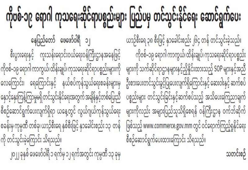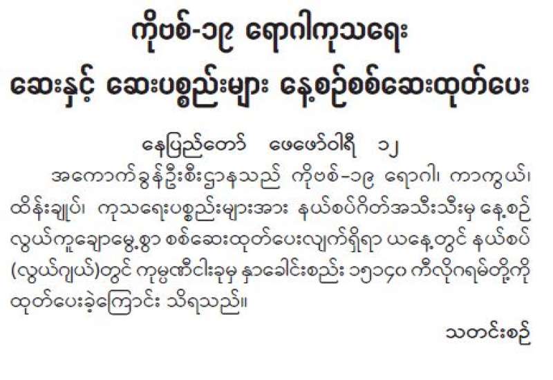 ကျန်းမာရေးဝန်ကြီးဌာနအနေဖြင့် နိုင်ငံအတွင်း ကူးစက်ဖြစ်ပွားနေသော COVID-19 ရောဂါ ကာကွယ်၊ ကုသ၊ ထိန်းချုပ်ရေး လုပ်ငန်းများကို အရှိန်အဟုန်မြှင့် ဆောင်ရွက်လျက်ရှိပါသည်။