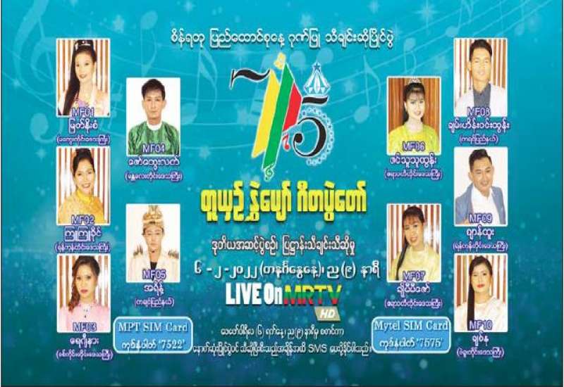 စိန်ရတုပြည်ထောင်စုနေ့ကို ဂုဏ်ပြုသောအားဖြင့် “တူယှဉ်နွှဲပျော်ဂီတပွဲတော်” သီချင်းဆိုပြိုင်ပွဲ ဒုတိယ အဆင့်ပွဲစဉ်၊ ပြဋ္ဌာန်းသီချင်းသီဆိုမှုကို ဖေဖော်ဝါရီ ၆ ရက် (တနင်္ဂနွေနေ့)ညတွင် မြန်မာ့ရုပ်မြင်သံကြားမှ တိုက်ရိုက် Live ရိုက်ကူးထုတ်လွှင့်မည်။