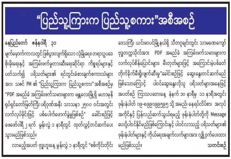ကရင်ပြည်နယ်၊ ဖာပွန်မြို့နယ်အတွင်း နယ်မြေလုံခြုံရေး ဆောင်ရွက်နေသည့် တပ်မတော်၏ ဒါးကွင်းခြေကုပ်စခန်းအား KNLA တပ်မဟာ(၅)အဖွဲ့နှင့် PDF အမည်ခံ အကြမ်းဖက်သမားများက ဇန်နဝါရီလ ၃၀ ရက် ညပိုင်းတွင် လက်နက်ကြီး/ လက်နက်ငယ်များ အသုံးပြုပြီး သာလွန်အင်အားဖြင့် အလစ်အငိုက်ဝင်ရောက်တိုက်ခိုက်ခဲ့သဖြင့် စခန်းမှလုံခြုံရေးတပ်ဖွဲ့ဝင် များနှင့် အနီးပတ်ဝန်းကျင်တွင် လုံခြုံရေးတာဝန် ထမ်းဆောင်နေသော လုံခြုံရေးတပ်ဖွဲ့ဝင် များက ပစ်ကူစစ်ကူများဖြင့် ပြန်လည်ခုခံ ပစ်ခတ်ထိန်းချုပ်တိုက်ခိုက်ခဲ့ရာ အကြမ်းဖက်သမား များ ဖရိုဖရဲ ဆုတ်ခွာထွက်ပြေးသွားခဲ့ကြောင်း မိမိဘက်မှ ထိခိုက်ဒဏ်ရာရရှိမှုမရှိကြောင်း သိရှိရသည်။