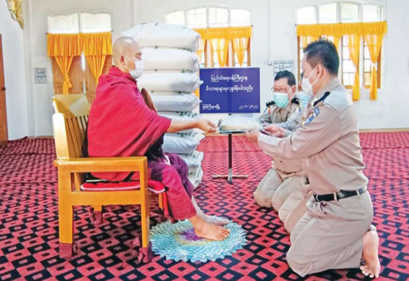 ကိုဗစ်- ၁၉ ရောဂါ ကြိုတင်ကာကွယ်ရေးလုပ်ငန်းများ ဆောင်ရွက်နေသည့် ကာလအတွင်း ဆွမ်းကိစ္စရပ်များ အဆင်ပြေစေရန် ရည်ရွယ်၍ ပြည်ထဲရေးဝန်ကြီးဌာန၊ တပ်ဖွဲ့ဝင်/ ဝန်ထမ်း အရာထမ်း၊ အမှုထမ်း မိသားစုများက မြို့နယ်အသီးသီးရှိ ဘုန်းတော်ကြီးကျောင်းများသို့ ဆွမ်းဆန်တော်များ ဆက်ကပ်လှူဒါန်းခြင်းကို ဆောင်ရွက်လျက်ရှိသည်။
