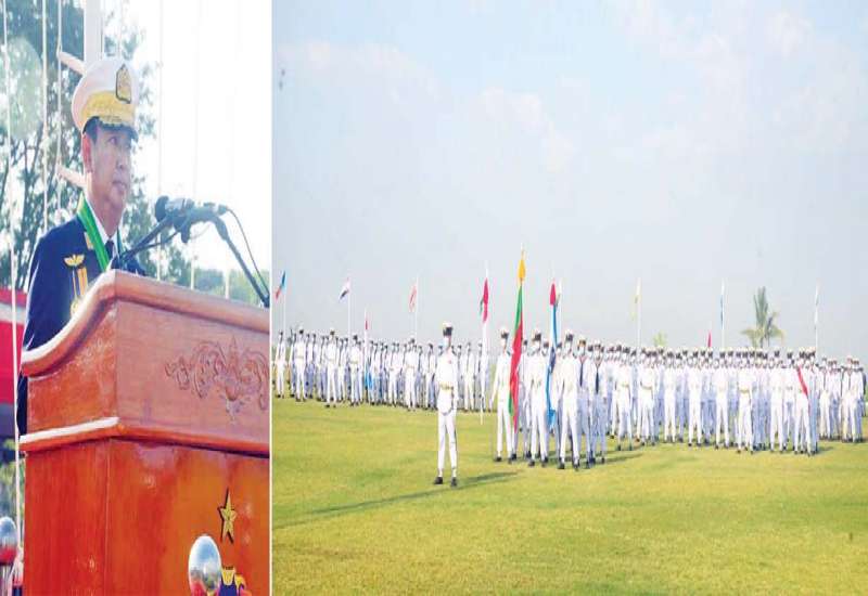 တပ်မတော်(ရေ)အရာရှိငယ် (စီမံခန့်ခွဲရေး)သင်တန်း အမှတ်စဉ်(၈၁)နှင့် တပ်မတော် (ရေ)အရာရှိငယ် (အင်ဂျင်နီယာ)သင်တန်း အမှတ်စဉ်(၅၅)သင်တန်းဆင်း ဂုဏ်ပြုစစ်ရေးပြ အခမ်းအနားကို ယနေ့နံနက်ပိုင်းတွင် သန်လျင်တပ်နယ်ရှိရေတပ် လေ့ကျင့်ရေးဌာနချုပ်စစ်ရေး ပြကွင်း၌ ကျင်းပရာ နိုင်ငံတော်စီမံအုပ်ချုပ်ရေး ကောင်စီဥက္ကဋ္ဌ တပ်မတော်ကာကွယ်ရေး ဦးစီးချုပ်ကိုယ်စား ကာကွယ်ရေးဦးစီးချုပ်(ရေ) ဗိုလ်ချုပ်ကြီး ဇေယျကျော်ထင်မိုးအောင် တက်ရောက်မိန့်ခွန်း ပြောကြားသည်။