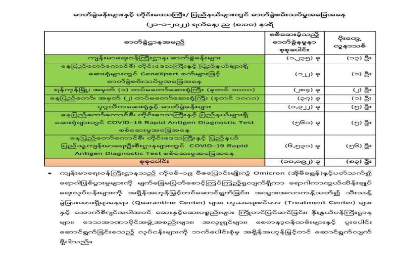 ကျန်းမာရေးဝန်ကြီးဌာနအနေဖြင့် နိုင်ငံအတွင်း ကူးစက်ဖြစ်ပွားနေသော COVID-19 ရောဂါ ကာကွယ်၊ ကုသ၊ ထိန်းချုပ်ရေးလုပ်ငန်းများကို အရှိန်အဟုန်မြှင့် ဆောင်ရွက်လျက်ရှိပါသည်။