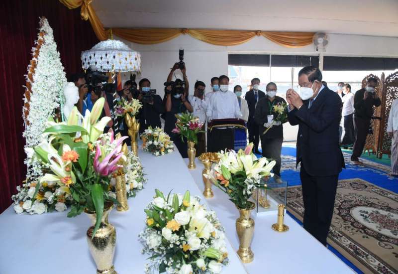 နိုင်ငံတော်စီမံအုပ်ချုပ်ရေးကောင်စီဥက္ကဋ္ဌ နိုင်ငံတော်ဝန်ကြီးချုပ် ဗိုလ်ချုပ်မှူးကြီး မင်းအောင်လှိုင်၏ ဖိတ်ကြားချက်အရ အလုပ်သဘောခရီးစဉ် အဖြစ်ရောက်ရှိနေသည့် ကမ္ဘောဒီးယားနိုင်ငံဝန်ကြီးချုပ် Samdech Akka Moha Sena Padei Techo HUN SEN သည် ယနေ့နံနက်ပိုင်းတွင် နေပြည်တော်ရှိ “မာရဝိဇယ” ဗုဒ္ဓရုပ်ပွားတော်မြတ် ကြီးထုဆစ်ခြင်းနှင့် တည်ထားကိုးကွယ်ရန် ဆောင်ရွက်နေမှုအခြေအနေများအား သွားရောက်ကြည့်ရှုလေ့လာသည်။
