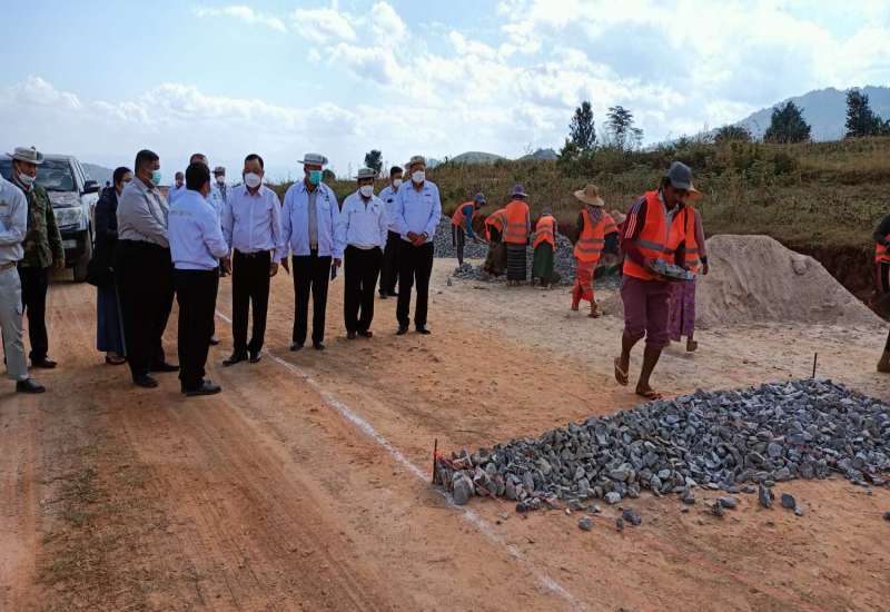 ဆောက်လုပ်ရေးဝန်ကြီးဌာန ဒုတိယဝန်ကြီး ဦးဝင်းဖေသည် ဌာနဆိုင်ရာတာဝန်ရှိသူများနှင့်အတူ ဒီဇင်ဘာ ၂၀ ရက် နံနက်ပိုင်းတွင် တောင်ပေါ်ဒေသ လမ်းဆောက်လုပ်ရေး ကုမ္ပဏီလီမိတက်မှ B.0.T စနစ်ဖြင့် ဆောင်ရွက်သော မိတ္ထီလာ - တောင်ကြီး| ကျိုင်းတုံ-တာချီလိတ်လမ်း (မိတ္ထီလာ-တောင်ကြီး)အပိုင်း လမ်းအဆင့်မြှင့်တင်ခြင်းလုပ်ငန်း ဆောင်ရွက်နေမှုအခြေအနေကို လမ်းတစ်လျှောက် ကြည့်ရှုစစ်ဆေးသည်။