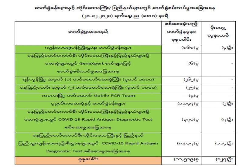 ကျန်းမာရေးဝန်ကြီးဌာနအနေဖြင့် နိုင်ငံအတွင်း ကူးစက်ဖြစ်ပွားနေသော COVID-19 ရောဂါ ကာကွယ်၊ ကုသ၊ ထိန်းချုပ်ရေးလုပ်ငန်းများကို အရှိန်အဟုန်မြှင့်ဆောင်ရွက်လျက်ရှိရာ ရောဂါ ထိန်းချုပ်ရေးလုပ်ငန်းများ အောင်မြင်နိုင်ရေးအတွက် ပြည်သူလူထုအနေဖြင့် ကျန်းမာရေးဝန်ကြီး ဌာနမှထုတ်ပြန်ထားသော COVID-19 ရောဂါကာကွယ်ထိန်းချုပ်ရေးဆိုင်ရာစည်းကမ်းများကို စနစ် တကျ လိုက်နာဆောင်ရွက်ရန်လိုအပ်ပြီး COVID-19 ကာကွယ်ဆေးထိုးနှံမှုခံယူခြင်းအား အထူး ဂရုပြု ပူးပေါင်းဆောင်ရွက်ကြရန် လိုအပ်ပါသည်။