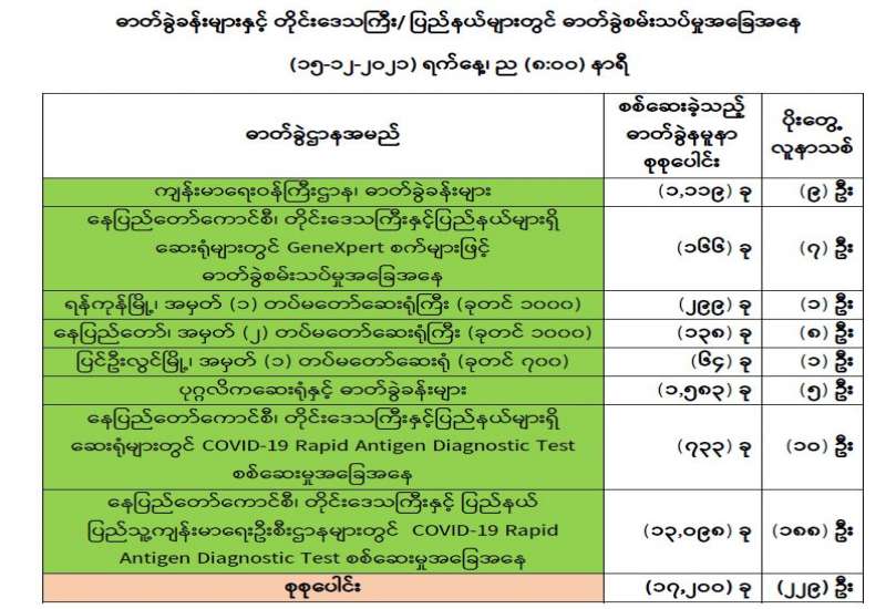 ကျန်းမာရေးဝန်ကြီးဌာနအနေဖြင့် နိုင်ငံအတွင်း ကူးစက်ဖြစ်ပွားနေသော COVID-19 ရောဂါ ကာကွယ်၊ ကုသ၊ ထိန်းချုပ်ရေးလုပ်ငန်းများကို အရှိန်အဟုန်မြှင့်ဆောင်ရွက်လျက်ရှိရာ ရောဂါ ထိန်းချုပ်ရေးလုပ်ငန်းများ အောင်မြင်နိုင်ရေးအတွက် ပြည်သူလူထုအနေဖြင့် ကျန်းမာရေးဝန်ကြီး ဌာနမှထုတ်ပြန်ထားသော COVID-19 ရောဂါကာကွယ်ထိန်းချုပ်ရေးဆိုင်ရာစည်းကမ်းများကို စနစ် တကျ လိုက်နာဆောင်ရွက်ရန်လိုအပ်ပြီး COVID-19 ကာကွယ်ဆေးထိုးနှံမှုခံယူခြင်းအား အထူး ဂရုပြု ပူးပေါင်းဆောင်ရွက်ကြရန် လိုအပ်ပါသည်။