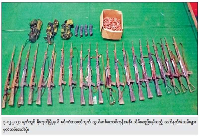 နိုင်ငံတော်အစိုးရအနေဖြင့် CRPH၊ NUG နှင့် PDF အကြမ်းဖက်အဖွဲ့များမှ ပြည်သူလူထု အထိတ်အလန့်ဖြစ်စေရန်အတွက် ဖောက်ခွဲဖျက်ဆီး ခြင်းနှင့် အပြစ်မဲ့ပြည်သူများအား လုပ်ကြံသတ်ဖြတ်ခြင်းစသည့် အကြမ်းဖက်လုပ်ရပ်များအား ဆောင်ရွက်နိုင်မှုမရှိစေရေး ဖော်ထုတ် ဖမ်းဆီးခြင်းများအား နေ့/ညမပြတ်ဆောင်ရွက်လျက်ရှိရာ အေးချမ်းစွာ နေထိုင်လိုသည့် တာဝန်သိပြည်သူများ၏ သတင်းပေးချက်အရ နိုဝင်ဘာလ ၁၅ ရက်တွင် မိုးကုတ်မြို့၊ လယ်ဦးရပ်ရှိ မိညောင်(ခ)ညီညီအောင်၏ နေအိမ်တွင်မိုးကုတ် PDF အကြမ်းဖက် အဖွဲ့ဝင်များ ရောက်ရှိနေကြောင်းသိရှိရသဖြင့် လုံခြုံရေးပူးပေါင်းအဖွဲ့မှ ဝင်ရောက်ရှာဖွေခဲ့ရာ တရားခံ အောင်ကိုဝင်း (၂၀)နှစ်အား KA-25 သေနတ် ခြောက်လက်၊ ကျည်အိမ် ခုနစ်ခု၊ ကျည် ၂၅၀ တောင့်၊ ကြိုးဆွဲလက်ပစ်ဗုံး နှစ်လုံး၊ အီကွေ့မန့် ခြောက်စုံတို့နှင့်အတူ ဖမ်းဆီးရမိခဲ့ပြီး တရားခံ အောင်ကိုဝင်း၏ ထွက်ဆိုချက်အရ မိုးကုတ်မြို့၊ လယ်ဦးကျေးရွာ၊ သံလွင်တောင်ရပ်ရှိ တောင်ယာတဲ၌ KA-25 သေနတ် နှစ်လက်အား ထပ်မံသိမ်းဆည်းရမိခဲ့သည်။
