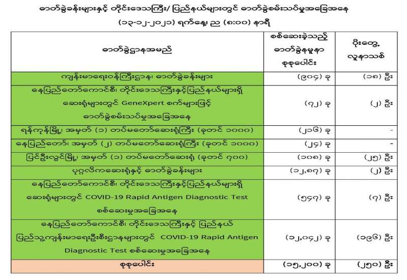 ကျန်းမာရေးဝန်ကြီးဌာနအနေဖြင့် နိုင်ငံအတွင်း ကူးစက်ဖြစ်ပွားနေသော COVID-19 ရောဂါ ကာကွယ်၊ ကုသ၊ ထိန်းချုပ်ရေးလုပ်ငန်းများကို အရှိန်အဟုန်မြှင့် ဆောင်ရွက်လျက်ရှိပါသည်။