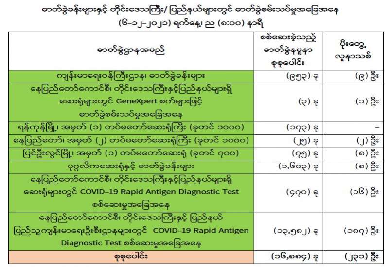 ကျန်းမာရေးဝန်ကြီးဌာနအနေဖြင့် နိုင်ငံအတွင်း ကူးစက်ဖြစ်ပွားနေသော COVID-19 ရောဂါ ကာကွယ်၊ ကုသ၊ ထိန်းချုပ်ရေးလုပ်ငန်းများကို အရှိန်အဟုန်မြှင့် ဆောင်ရွက်လျက်ရှိပါသည်။