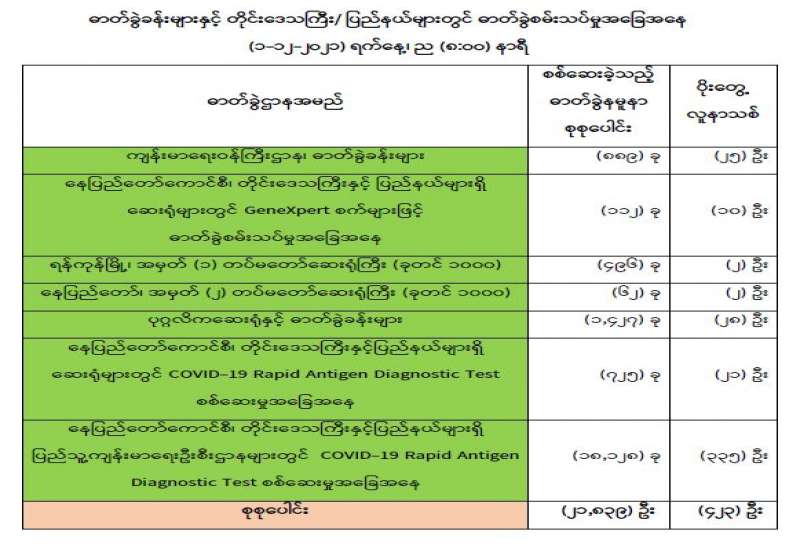 ကျန်းမာရေးဝန်ကြီးဌာနအနေဖြင့် နိုင်ငံအတွင်း ကူးစက်ဖြစ်ပွားနေသော COVID-19 ရောဂါ ကာကွယ်၊ ကုသ၊ ထိန်းချုပ်ရေးလုပ်ငန်းများကို အရှိန်အဟုန်မြှင့်ဆောင်ရွက်လျက်ရှိရာ ရောဂါ ထိန်းချုပ်ရေးလုပ်ငန်းများ အောင်မြင်နိုင်ရေးအတွက် ပြည်သူလူထုအနေဖြင့် ကျန်းမာရေး ဝန်ကြီး ဌာနမှထုတ်ပြန်ထားသော COVID-19 ရောဂါကာကွယ်ထိန်းချုပ်ရေးဆိုင်ရာ စည်းကမ်းများကို စနစ်တကျ လိုက်နာဆောင်ရွက်ရန် လိုအပ်ပြီး COVID-19 ကာကွယ်ဆေး ထိုးနှံမှုခံယူခြင်းအား အထူးဂရုပြု ပူးပေါင်းဆောင်ရွက်ကြရန် လိုအပ်ပါသည်။