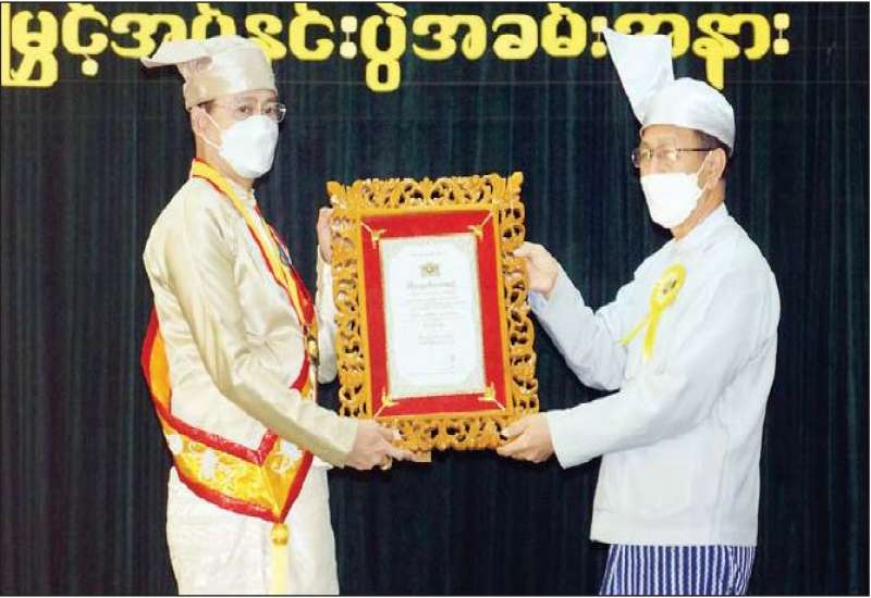 ပြည်ထောင်စုသမ္မတမြန်မာနိုင်ငံတော် နိုင်ငံတော်စီမံအုပ်ချုပ်ရေးကောင်စီ ၂၀၂၁ ခုနှစ်၊ သာသနာတော်ဆိုင်ရာ သာသနာနုဂ္ဂဟ ဘွဲ့တံဆိပ် ချီးမြှင့်ပွဲ အခမ်းအနားအား ယနေ့ မွန်းလွဲပိုင်းတွင် နေပြည်တော်ရှိ နိုင်ငံတော်စီမံအုပ်ချုပ်ရေးကောင်စီဥက္ကဋ္ဌရုံး သဘင်ဆောင်ခန်းမ၌ ကျင်းပပြုလုပ်ရာ နိုင်ငံတော်စီမံအုပ်ချုပ်ရေးကောင်စီဥက္ကဋ္ဌ နိုင်ငံတော်ဝန်ကြီးချုပ် ဗိုလ်ချုပ်မှူးကြီး မင်းအောင်လှိုင် တက်ရောက်၍ ဘွဲ့တံဆိပ်နှင့် အဆောင်အယောင်များ ချီးမြှင့်အပ်နှင်းသည်။