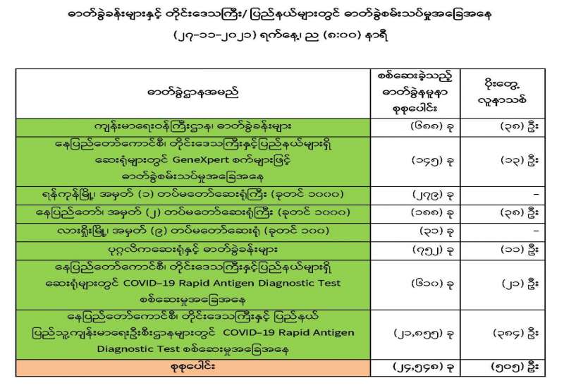 ကျန်းမာရေးဝန်ကြီးဌာနအနေဖြင့် နိုင်ငံအတွင်း ကူးစက်ဖြစ်ပွားနေသော COVID-19 ရောဂါ ကာကွယ်၊ ကုသ၊ ထိန်းချုပ်ရေးလုပ်ငန်းများကို အရှိန်အဟုန်မြှင့်ဆောင်ရွက်လျက်ရှိပါသည်။