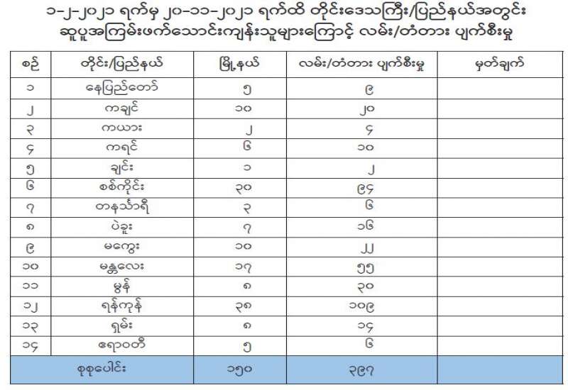 ရန်ကုန်တိုင်းဒေသကြီး၊ လှိုင်သာယာ(အရှေ့ပိုင်း)မြို့နယ်၊ ရွှေလင်ပန်း ကျေး ရွာ၌ ကျော်မိုးနိုင်(ခ)မောင်နိုင်(ဘ)ဦးမြင့်ဦး အပါအဝင် ၁၈ ဦးသည် စက်တင်ဘာ ၂၈ ရက် ည ၁၀ နာရီခန့်တွင် ကျူးကျော်နေအိမ်နှင့် အိမ်ခြံမြေကိစ္စများတွင် အခကြေး ငွေရယူ၍ နေအိမ်များနှင့် ခြံစည်းရိုးများအား ဖျက်ဆီးခြင်း၊ နေအိမ်အတွင်းရှိ လူများ အား တုတ်၊ ဓားများ ကိုင်ဆောင်၍ အကြမ်းဖက်တိုက်ခိုက် ခြိမ်းခြောက်ခြင်းစသည့် ဉပဒေမဲ့လုပ်ရပ်များကို ကျူးလွန်ခဲ့သည့် အတွက်ကြောင့် အကြမ်းဖက်မှုတိုက်ဖျက် ရေးဉပဒေပုဒ်မ ၅၀(က)ဖြင့်လည်းကောင်း၊ ရဲထက်(ဘ) ဦးသိန်းဦး သည် ဧပြီ ၁၀ ရက်နေ့မှ ၁၇ ရက်အထိ တိုင်းရင်းသားလက်နက်ကိုင်အဖွဲ့ နယ်မြေအတွင်း သင်တန်းတက်ရောက်ခဲ့သဖြင့် ပြည်ထောင်စုသမ္မတမြန်မာနိုင်ငံတော် အကြမ်းဖက် မှုတိုက်ဖျက်ရေး ဗဟိုအဖွဲ့၊ အမိန့်ကြေညာစာအမှတ်၊(၂/၂၀၂၁)အရ အကြမ်းဖက်မှု တိုက်ဖျက်ရေးဉပဒေပုဒ်မ ၅၀(ည)ဖြင့် လည်းကောင်း၊ မောင်မောင်ကျော်တင့်(ခ) ဘိုဘိုကျော် (ဘ)ဦးလှတင့်သည်
