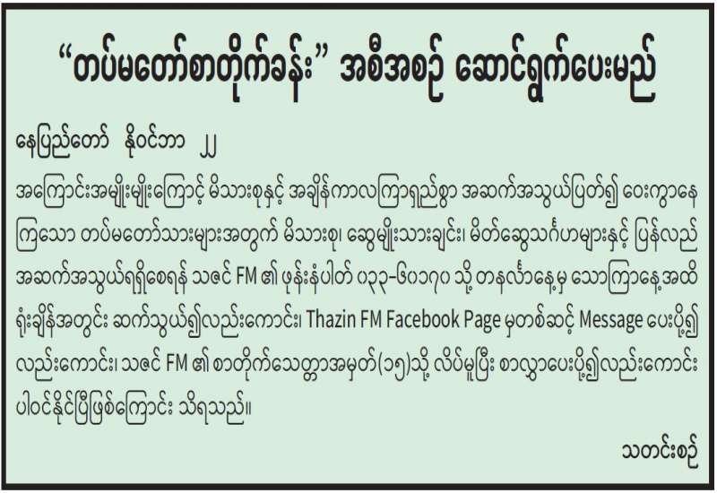 ကျန်းမာရေးဝန်ကြီးဌာနအနေဖြင့် နိုင်ငံအတွင်း ကူးစက်ဖြစ်ပွားနေသော COVID-19 ရောဂါ ကာကွယ်၊ ကုသ၊ ထိန်းချုပ်ရေးလုပ်ငန်းများကို အရှိန်အဟုန်မြှင့်ဆောင်ရွက်လျက်ရှိရာ ရောဂါ ထိန်းချုပ်ရေးလုပ်ငန်းများ အောင်မြင်နိုင်ရေးအတွက် ပြည်သူလူထုအနေဖြင့် -