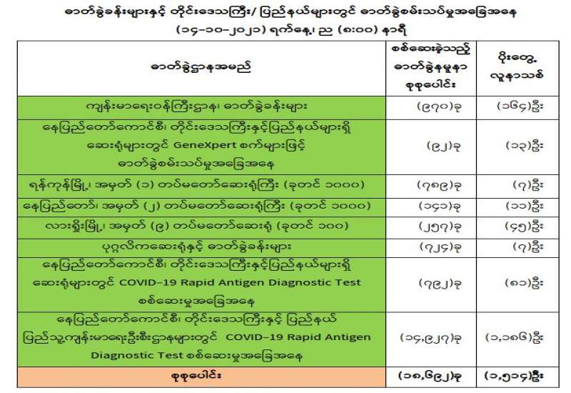 ကျန်းမာရေးဝန်ကြီးဌာနအနေဖြင့် နိုင်ငံအတွင်း ကူးစက်ဖြစ်ပွားနေသော COVID-19 ရောဂါ ကာကွယ်၊ ကုသ၊ ထိန်းချုပ်ရေးလုပ်ငန်းများကို အရှိန်အဟုန်မြှင့်ဆောင်ရွက်လျက်ရှိရာ ရောဂါ ထိန်းချုပ်ရေးလုပ်ငန်းများ အောင်မြင်နိုင်ရေးအတွက် ပြည်သူလူထုအနေဖြင့် -