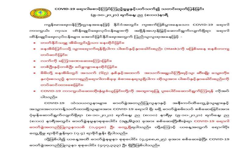 ကူးစက်မြန်ဗီဇပြောင်း ကိုရိုနာဗိုင်းရပ်စ်များ ကမ္ဘာအနှံ့နိုင်ငံအသီးသီး တို့တွင် အရှိန်အဟုန်ဖြင့် ဆက်လက်ပြန့်ပွား လျက်ရှိစဉ် မိမိတို့နိုင်ငံ ၌သိသိသာသာလျော့နည်းကျဆင်းလာခဲ့သည်မှာ ဝမ်းမြောက်ဖွယ်ရာ ပင်ဖြစ်သည်။ သို့ရာတွင် စိတ်ချရလောက်သည့် အခြေအနေသို့ မရောက်ရှိသေးဘဲ နေ့စဉ်ရောဂါပိုးကူးစက်မှု တွေ့ရှိရသည့် နှုန်းမှာ ၇ ရာခိုင်နှုန်းနှင့် ၈ ရာခိုင်နှုန်းတို့၏ဝန်းကျင်တွင် တရစ်ဝဲဝဲဖြစ်နေသည်။ ရောဂါပိုးကူးစက်မှု ၅ ရာခိုင်နှုန်းအောက်သို့ ဆက်လက်ကျဆင်းလျော့နည်းသွားရန် လူတိုင်းအသိကိုယ်စီဖြင့် ကြိုးပမ်းကြရ ဦးမည်ဖြစ်သည်။