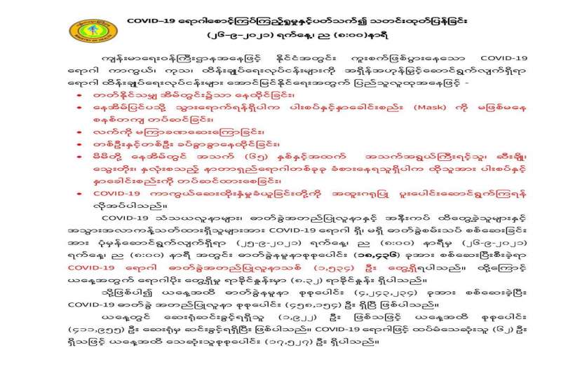 ကျန်းမာရေးဝန်ကြီးဌာနအနေဖြင့် နိုင်ငံအတွင်း ကူးစက်ဖြစ်ပွားနေသော COVID-19 ရောဂါ ကာကွယ်၊ ကုသ၊ ထိန်းချုပ်ရေး လုပ်ငန်းများကို အရှိန်အဟုန်မြှင့်ဆောင်ရွက်လျက်ရှိရာ ရောဂါ ထိန်းချုပ်ရေးလုပ်ငန်းများ အောင်မြင်နိုင်ရေးအတွက် ပြည်သူလူထု အနေဖြင့် ကျန်းမာရေးဝန်ကြီး ဌာနမှ ထုတ်ပြန်ထားသော COVID-19 ရောဂါကာကွယ်ထိန်းချုပ်ရေးဆိုင်ရာ စည်းကမ်းများကို စနစ်တကျ လိုက်နာဆောင်ရွက်ရန်လိုအပ်ပြီး COVID-19 ကာကွယ်ဆေးထိုးနှံမှုခံယူခြင်းအား အထူး ဂရုပြု ပူးပေါင်းဆောင်ရွက် ကြရန်လိုအပ်ပါသည်။