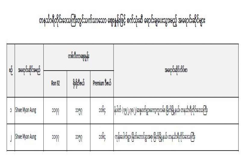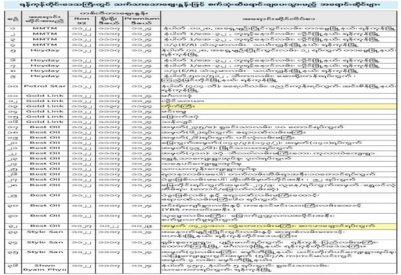 စီးပွားရေးနှင့် ကူးသန်းရောင်းဝယ်ရေးဝန်ကြီးဌာနနှင့် မြန်မာနိုင်ငံ စက်သုံးဆီတင်သွင်း ဖြန့်ဖြူးရောင်းချ ရေးအသင်းတို့ ပူးပေါင်းစီစဉ်မှုဖြင့် ပြည်သူများသက်သာသောဈေးနှုန်းဖြင့် ဝယ်ယူရရှိနိုင်ရန် ရည်ရွယ်၍ ဗဟိုဘဏ်မှ ရည်ညွှန်းငွေလဲနှုန်းဖြင့် တိုက်ရိုက်ရောင်းချပေးသည့် နိုင်ငံခြားငွေဖြင့် မှာယူတင်သွင်းခဲ့သည့် စက်သုံးဆီများကို စက်တင်ဘာ ၂၂ ရက်မှ စတင်ရောင်းချလျက်ရှိပြီး ယနေ့မှစ၍ ရန်ကုန်တိုင်းဒေသကြီး၊ မန္တလေးတိုင်းဒေသကြီးနှင့် နေပြည်တော်တို့တွင် အောက်ဖော်ပြပါ ဈေးနှုန်းများအတိုင်း ရောင်းချပေး သွားမည်ဖြစ်သည်-