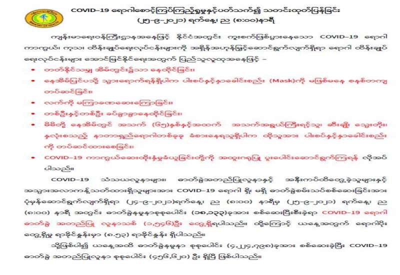ကျန်းမာရေးဝန်ကြီးဌာနအနေဖြင့် နိုင်ငံအတွင်း ကူးစက်ဖြစ်ပွားနေသော COVID-19 ရောဂါ ကာကွယ်၊ ကုသ၊ ထိန်းချုပ်ရေး လုပ်ငန်းများကို အရှိန်အဟုန်မြှင့်ဆောင်ရွက်လျက်ရှိရာ ရောဂါ ထိန်းချုပ်ရေးလုပ်ငန်းများ အောင်မြင်နိုင်ရေးအတွက် ပြည်သူလူထု အနေဖြင့် ကျန်းမာရေး ဝန်ကြီးဌာနမှ ထုတ်ပြန်ထားသော COVID-19 ရောဂါကာကွယ်ထိန်းချုပ်ရေးဆိုင်ရာ စည်းကမ်း များကို စနစ်တကျ လိုက်နာဆောင်ရွက်ရန်လိုအပ်ပြီး COVID-19 ကာကွယ်ဆေးထိုးနှံမှု ခံယူခြင်းအား အထူးဂရုပြု ပူးပေါင်းဆောင်ရွက် ကြရန် လိုအပ်ပါသည်။