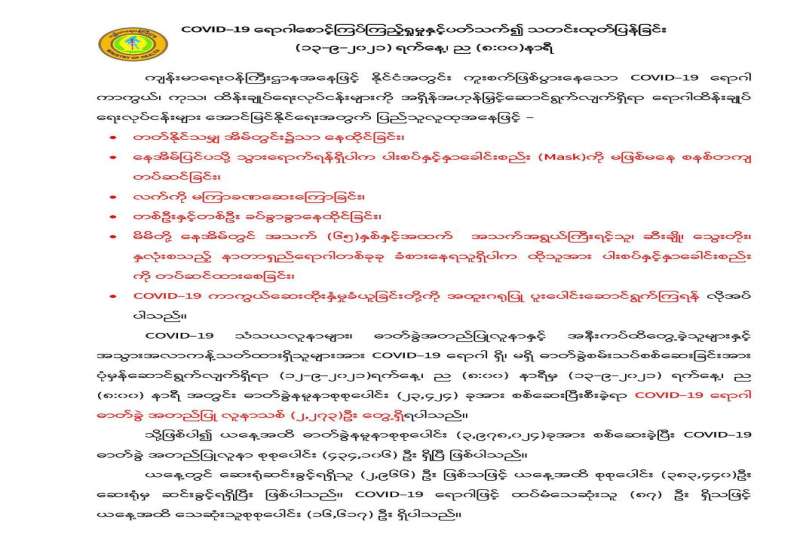 မြန်မာ့အသံနှင့် ရုပ်မြင်သံကြားမှ စက်တင်ဘာ ၁၁ ရက် ည ၈ နာရီ သတင်းအပြီးတွင် ထုတ်လွှင့်ပြသခဲ့သည့် ကိုဗစ်-၁၉ ရောဂါ ကာကွယ်ထိန်းချုပ်ရေးဆိုင်ရာ ဆောင်ရွက်ချက်များအကြောင်း သိကောင်းစရာအစီအစဉ်ကို ပြည်သူများသိရှိနိုင်ရန်အတွက် ပြန်လည်ဖော်ပြလိုက်ပါသည်။