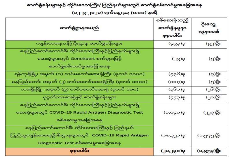 စီးပွားရေးနှင့် ကူးသန်းရောင်းဝယ်ရေးဝန်ကြီးဌာန အနေဖြင့် ကိုဗစ်-၁၉ ရောဂါ ကာကွယ်၊ ထိန်းချုပ်၊ ကုသရေးဆိုင်ရာပစ္စည်းများကို အများပြည်သူရုံးပိတ်ရက်များတွင် လေကြောင်း၊ ရေကြောင်းနှင့် နယ်စပ်ကုန်သွယ်ရေးစခန်းများမှ နှောင့်နှေးကြန့်ကြာမှုမရှိ တင်သွင်းနိုင်ရေး အတွက် အချိန်နှင့် တပြေးညီ စီစဉ်ဆောင်ရွက်ပေးလျက်ရှိရာ ယနေ့တွင် ဆိပ်ကမ်းများနှင့် မူဆယ်၊ ချင်းရွှေဟော်၊ မြဝတီနှင့် တာချီလိတ် စခန်း (၄)ခု တို့မှ တင်သွင်း ရာ၌ ကုမ္ပဏီ (၁၆)ခု မှ ယာဉ်စီးရေ (၂၄)စီး ဖြင့် အောက်ဆီဂျင်(အရည်) Bowser ယာဉ် (၂)စီးဖြင့် (၄၀) တန်၊ Storage Container/ Tank (၁) ခု၊ အောက်ဆီဂျင် (အရည်) Distributor (၁)ခု၊ အောက်ဆီဂျင်(အိုးခွံ) (၂၃၃၀)ခု၊ Oxygen Plant (၄)ခု၊ Oxygen Generator(၆)ခု၊ အိမ်သုံး Oxygen Concentrator (၁)ခု နှင့် နှာခေါင်းစည်း (Mask) (၄၅)တန် တင်သွင်းခဲ့သည်။ အောက်ဆီဂျင် အရည် (Bowser)ယာဉ် (၂)စီးမှာ ရန်ကုန်မြို့သို့ဖြစ်ပြီး Oxygen Plant (၄)ခု မှာ ရန်ကုန်မြို့သို့ (၃)ခုနှင့် တန့်ယန်းမြို့သို့(၁)ခုတို့ ဖြစ်ကြောင်း သိရှိရသည်။