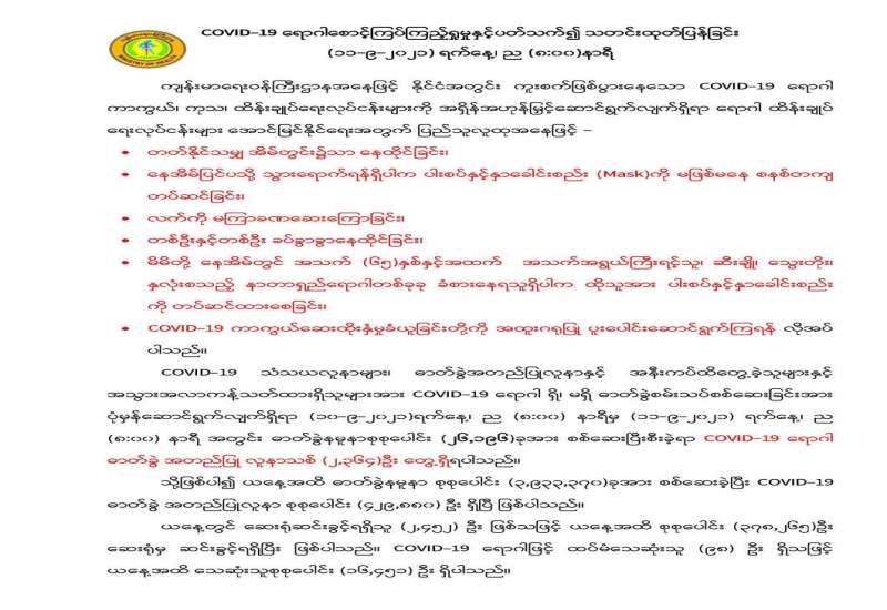 ကိုဗစ်-၁၉ ရောဂါအတည်ပြု လူနာများနှင့် သီးသန့်စောင့်ကြည့်ရမည့် သူများထားရှိရန်အတွက် တိုင်းစစ်ဌာနချုပ် နယ်မြေအသီးသီးရှိ တပ်မတော်ဆေးရုံများ၊ နယ်မြေခံသင်တန်းကျောင်းများ၊ စစ်ကြောရေးနှင့် တည်းခိုရေးစခန်းများ၌ ကြိုတင်ပြင်ဆင်မှုများကို လုပ်ဆောင်လျက်ရှိပြီး ပြီးစီးသည့် နေရာများတွင် စနစ်တကျလက်ခံ၍ ကျန်းမာရေးစောင့်ရှောက်မှုလုပ်ငန်းများ ဆောင်ရွက်ပေးလျက်ရှိ သည်။ ထို့ပြင် ကျန်းမာရေးဝန်ကြီးဌာနနှင့် အခြားဌာနဆိုင်ရာတာဝန်ရှိသူများ၊ ပရဟိတ အဖွဲ့အစည်းများ၊ တာဝန်သိပြည်သူများနှင့် ပူးပေါင်း၍လည်း သက်ဆိုင်ရာ မြို့နယ်များ၌ Quarantine Center များကိုလည်း ပြင်ဆင်ဆောင်ရွက်လျက် ရှိသည်။