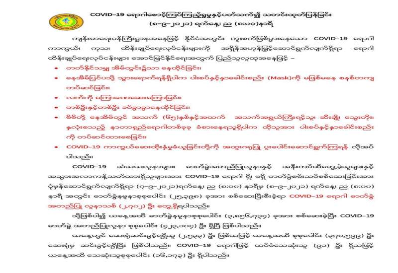 နိုင်ငံတော်အတွင်း၌ ကိုဗစ်-၁၉ ကာကွယ်၊ထိန်းချုပ်၊ကုသရေးလုပ်ငန်းများအတွက် အရေးတကြီး လိုအပ်လျက်ရှိသည့် အောက်ဆီဂျင်အရည်၊ အောက်ဆီဂျင်ဓာတ်ငွေ့၊ အိမ်သုံးအောက်ဆီဂျင် စက်နှင့်ဆေးဝါးနှင့်ဆက်စပ်ပစ္စည်းများ ပြတ်လပ်မှုမရှိစေရန် အများပြည်သူ ရုံးပိတ်ရက် များတွင် လေကြောင်း၊ ရေကြောင်းနှင့် နယ်စပ်ကုန်သွယ်ရေးစခန်းများမှ စဉ်ဆက်မပြတ် တင်သွင်းနိုင်ရေး အတွက် စီးပွားရေးနှင့်ကူး သန်းရောင်းဝယ်ရေးဝန်ကြီးဌာနမှ ဆောင်ရွက်ပေးလျက်ရှိရာ ၈-၉-၂၀၂၁ ရက်နေ့တွင် ရန်ကုန်အပြည်ပြည်ဆိုင်ရာလေဆိပ် ၊ ဆိပ်ကမ်းများနှင့် မူဆယ်၊ ချင်းရွှေဟော်၊ လွယ်ဂျယ်၊ မြဝတီနှင့် တာချီလိတ်ကုန်သွယ်ရေးစခန်း (၅) ခု တို့မှ တင်သွင်းရာ၌ ကုမ္ပဏီ (၁၅) ခုမှ ယာဉ်စီးရေ (၂၈) စီးဖြင့် အောက်ဆီဂျင်(အရည်) Bowser ယာဉ် (၂)စီး ဖြင့်(၄၁)တန်၊ Oxygen Storage Container/ Tank (၂)ခု ၊ အောက်ဆီဂျင် (အိုးခွံ) (၃၅၀၆) ခု၊ Oxygen Plant (၁)ခု၊ Oxygen Generator (၁) ခု၊ အိမ်သုံး Oxygen Concentrator (၁၆၀၈) ခု၊ Test Kit အခု (၇၅၀၀) ၊ PPE ဝတ်စုံ (၃၁၆၀၀) နှင့် နှာခေါင်းစည်း (Mask) (၃၃) တန်တင်သွင်းခဲ့သည်။ အောက်ဆီဂျင် (အရည်) Bowser ယာဉ် (၂)စီးမှာ ရန်ကုန်မြို့ နှင့်မုံရွာမြို့သို့(၁)စီးစီဖြစ်ပြီး Oxygen Plant(၁)ခုမှာ ရန်ကုန်မြို့သို့ ဖြစ်ကြောင်းသိရှိရသည်။