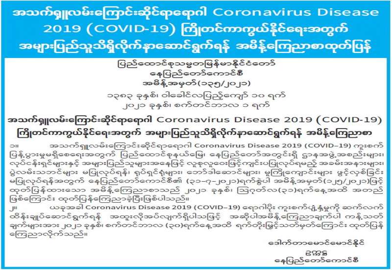 ကျန်းမာရေးဝန်ကြီးဌာနအနေဖြင့် နိုင်ငံအတွင်း ကူးစက်ဖြစ်ပွားနေသော COVID-19 ရောဂါကာကွယ်၊ ကုသ၊ ထိန်းချုပ်ရေးလုပ်ငန်းများကို အရှိန်အဟုန်မြှင့်ဆောင်ရွက်လျက်ရှိရာ ရောဂါထိန်းချုပ်ရေးလုပ်ငန်းများ အောင်မြင်နိုင်ရေးအတွက် ပြည်သူလူထုအနေဖြင့် -