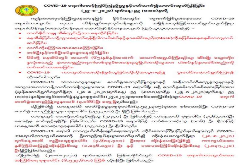မြန်မာနိုင်ငံတွင် ကိုဗစ်-၁၉ ရောဂါ ဖြစ်ပွားမှုနှင့်ပတ်သက်၍ ယမန်နှစ် ပထမလှိုင်းနှင့် ဒုတိယလှိုင်းဖြစ်ပွားစဉ်က ရောဂါကူးစက်ဖြစ်ပွားမှု၊ ထိခိုက်မှုနည်းပါးခဲ့သော်လည်း ယခုနှစ် တတိယလှိုင်းဖြစ်ပွားချိန်တွင် ရောဂါကူးစက်မှု၊ ထိခိုက်ပျက်စီးမှု မြင့်မားခဲ့သည်ကို တွေ့ရမည် ဖြစ်သည်။ သို့သော် နိုင်ငံတော်စီမံအုပ်ချုပ်ရေးကောင်စီ၏ မျက်ခြည်မပြတ် အရေးတယူ ဆောင်ရွက်မှုနှင့် သက်ဆိုင်ရာတာဝန်ရှိသူများ စေတနာရှေ့ထား၍ ဖိဖိစီးစီးဆောင်ရွက်ပေးမှုများ ကြောင့် ယခုအခါ ကိုဗစ်-၁၉ ရောဂါကူးစက်ဖြစ်ပွားမှုနှုန်းမှာ အတိုင်းအတာတစ်ခုအထိ လျော့ကျလာသည်ဟု ဆိုနိုင်ပါသည်။